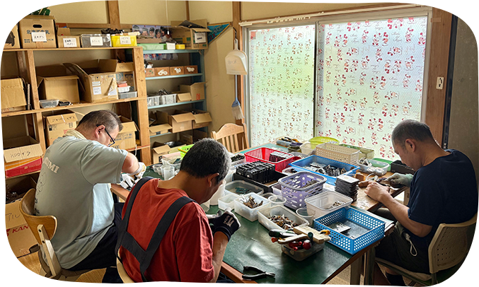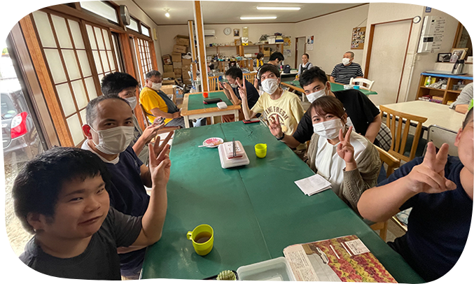 職員によるきめ細やかな生活サポート。そして自分の生活リズムを整えながら、社会的意味のある仕事をして収入増やし、自立を目指す場所です。やりがいや将来への希望を感じながら通える場所となるよう、一人ひとりに与えらる仕事を柔軟に設定しています。